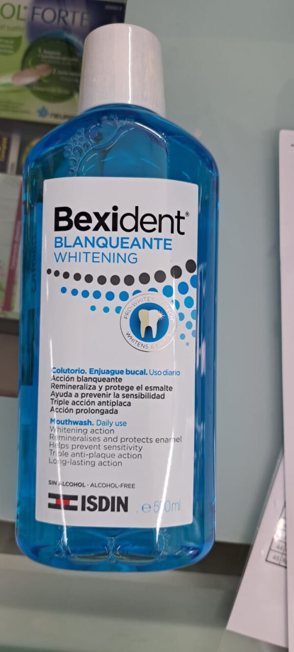 Bexident Blanqueante Colutorio es un enjuague bucal que tras 7 días muestra los primeros resultados. Su fórmula ha sido creada para remineralizar el diente, fortalecer y protegerlo, a la vez que le devuelve su tono blanco. Proporciona una triple acción antiplaca que lucha contra la formación del biofilm oral.